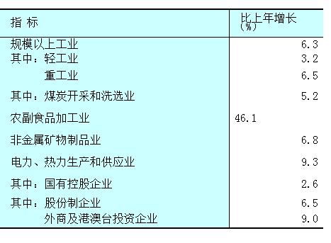 全年全市规模以上工业增加值增长6.3%,其中,煤炭行业增长5.2%,非煤行业增长8.6%。规模以上工业中,战略性新兴产业增长10.3%,占全市规模以上工业增加值的比重为1.5%。